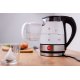 Czajnik jest wyposażony w potrójny system zabezpieczający i wyłącza się automatycznie po zagotowaniu wody. Jego pracę można również przerwać w dowolnym momencie, używając włącznika. Na ściankach dzbanka znajduje czytelna podziałka - wskaźnik maksymalnego i minimalnego poziomu wody, a filtr siatkowy, zamontowany w urządzeniu, zapobiega przedostawaniu się do naczynia ewentualnych cząsteczek kamienia.