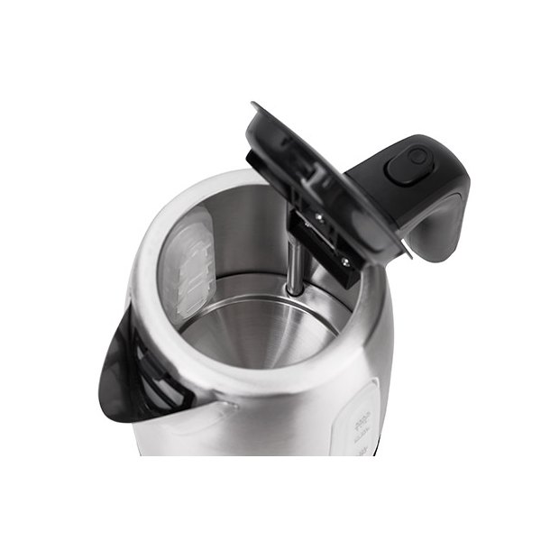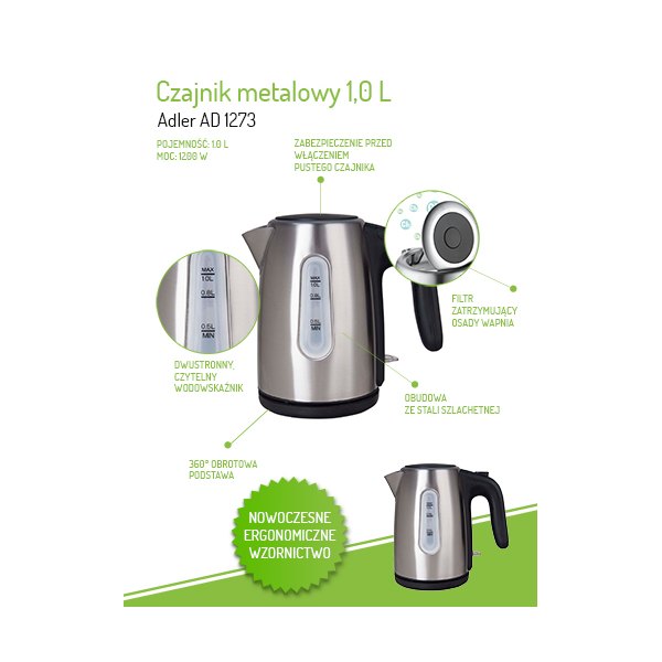 Klasyczny, 1-litrowy czajnik elektryczny, przydatny w każdej kuchni, biurze i akademiku. Jego bezpieczeństwo zapewnia blokada uniemożliwiająca włączenie pustego czajnika, oraz automatyczne wyłączenie po zagotowaniu wody. Czajnik wyposażony jest w filtr zatrzymujący osady, który poprawia smak i jakość wody. Funkcjonalność zwiększa stabilna podstawa i czytelny dwustronny wskaźnik poziomu wody. Dysponuje mocą 1200 W i wykonany jest ze stali szlachetnej, co czyni go mistrzowskim rozwiązaniem, jeśli chodzi o szybkie gotowanie wody. O gotowaniu wody informuje za pomocą lampki LEDowej, która uzupełnia jego nowoczesny wygląd i srebrną obudowę.