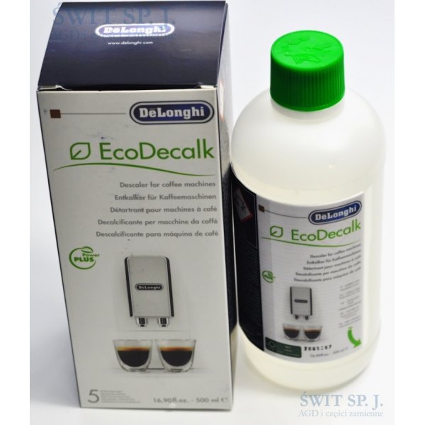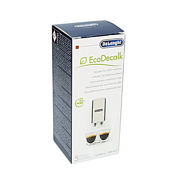 Regularne stosowanie odkamieniacza EcoDecalk produkcji De Longhi zapewnia dłuższą żywotność ekspresu do kawy i zwiększa wydajność energetyczną (nagromadzony osad z wapnia może zwiększać zużycie energii aż do 30%. Opakowanie o pojemności 500 ml wystarcza do 5-krotnego użycia.